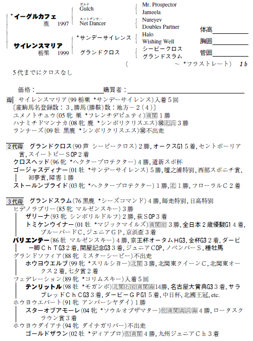父:イーグルカフェ 母:サイレンスマリア(母父:サンデーサイレンス)
