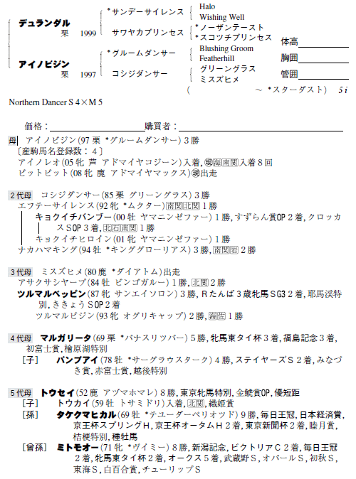 父:デュランダル 母:アイノビジン(母父:グルームダンサー)