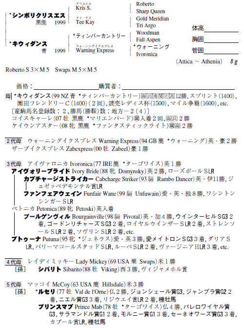 父:シンボリクリスエス 母:キウィダンス(母父:ティンバーカントリー)