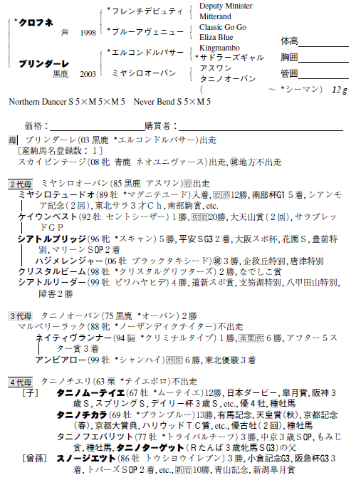 父:クロフネ 母:ブリンダーレ(母父:エルコンドルパサー)