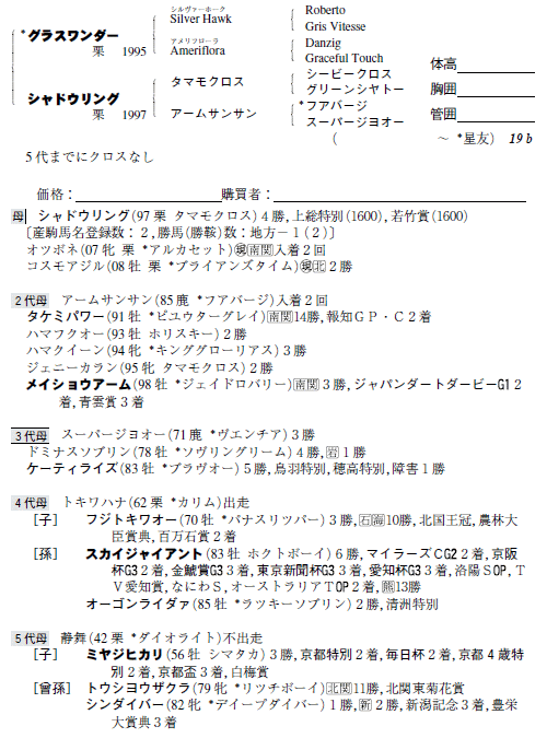 父:グラスワンダー 母:シャドウリング(母父:タマモクロス)