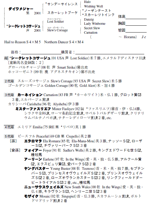 父:ダイワメジャー 母:シークレットコサージュ(母父:Lost Soldier)
