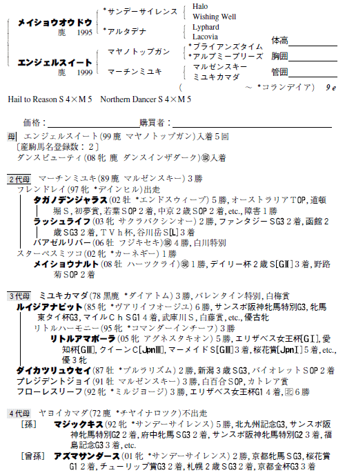 父:メイショウオウドウ 母:エンジェルスイート(母父:マヤノトップガン)