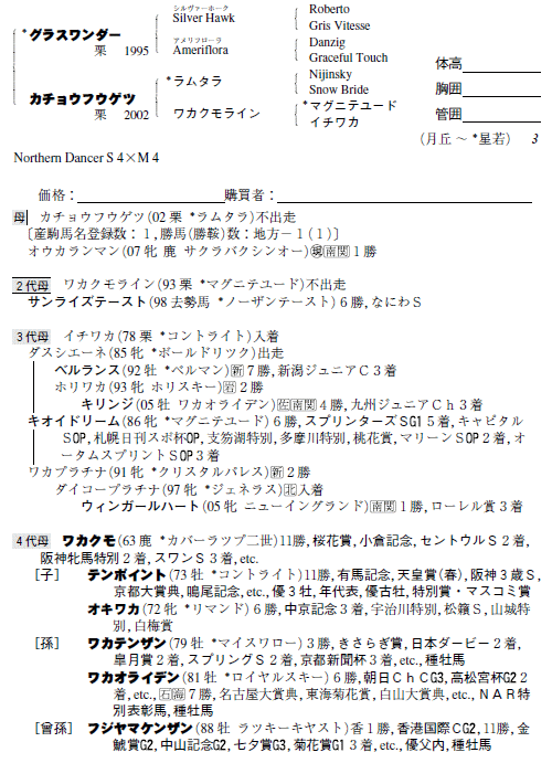 父:グラスワンダー 母:カチョウフウゲツ(母父:ラムタラ)