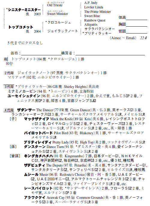 父:シニスターミニスター 母:トップコメット(母父:クロコルージュ)