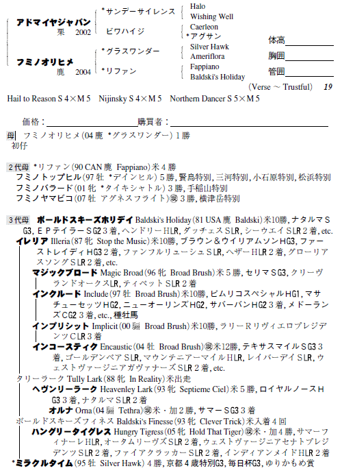 父:アドマイヤジャパン 母:フミノオリヒメ(母父:グラスワンダー)