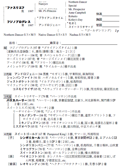 父:ファスリエフ 母:フジノプログレス(母父:ブライアンズタイム)