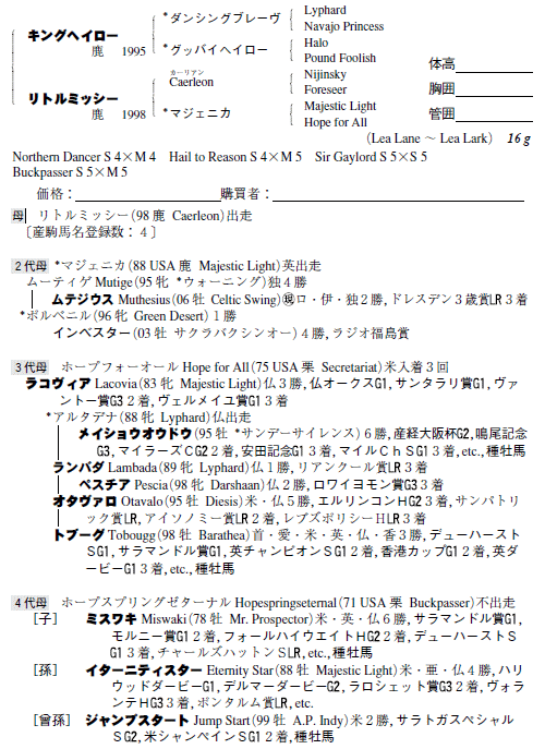 父:キングヘイロー 母:リトルミッシー (母父:Caerleon)