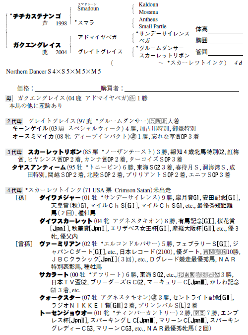 父:チチカステナンゴ 母:ガクエングレイス(母父:アドマイヤベガ)