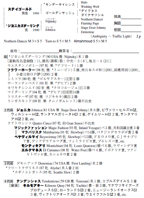 父:ステイゴールド 母:ジヨニカズダーリング(母父:Nijinsky)