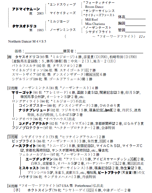 父:アドマイヤムーン 母:タヤスオドリコ(母父:ミルジヨージ)
