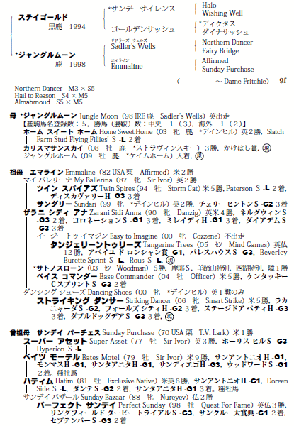 父:ステイゴールド 母:ジャングルムーン(母父:Sadler's Wells)