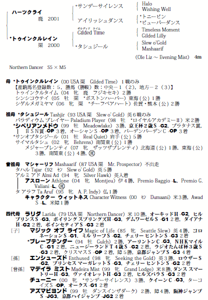 父:ハーツクライ 母:トゥインクルレイン(母父:Gilded Time)
