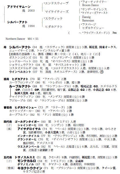 父:アドマイヤムーン 母:シルバーアクト(母父:スラヴィック)