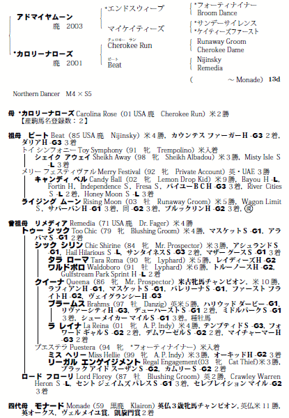 父:アドマイヤムーン 母:カロリーナローズ(母父:Cherokee Run)