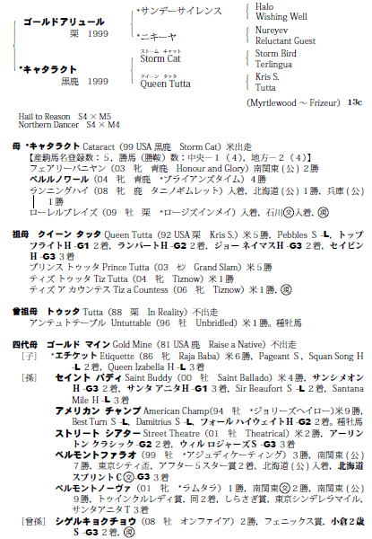 父:ゴールドアリュール 母:キャタラクト(母父:Storm Cat)