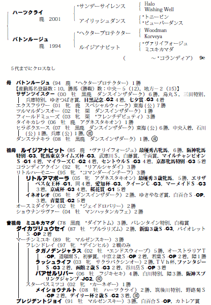 父:ハーツクライ 母:バトンルージュ(母父:ヘクタープロテクター)