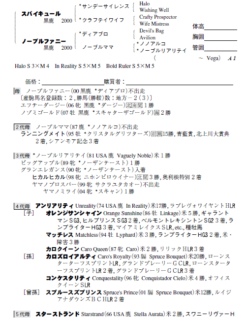 父:スパイキュール 母:ノーブルファニー(母父:ディアブロ)