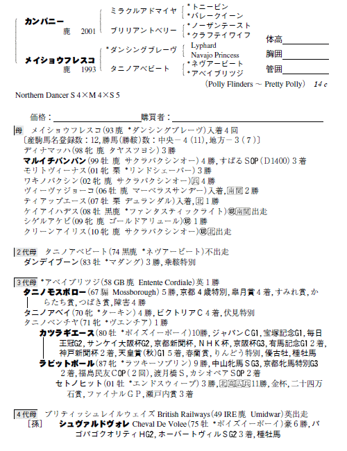 父:カンパニー 母:メイショウフレスコ(母父:ダンシングブレーヴ)