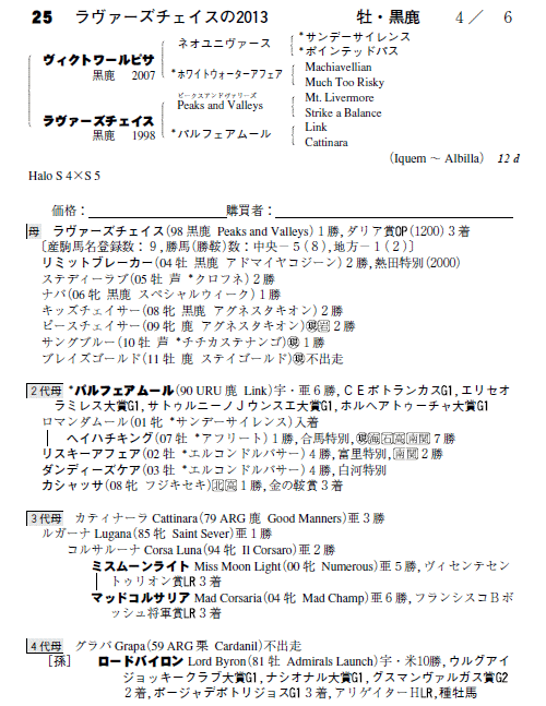 父:ヴィクトワールピサ 母:ラヴァーズチェイス(母父:Peaks and Valleys)