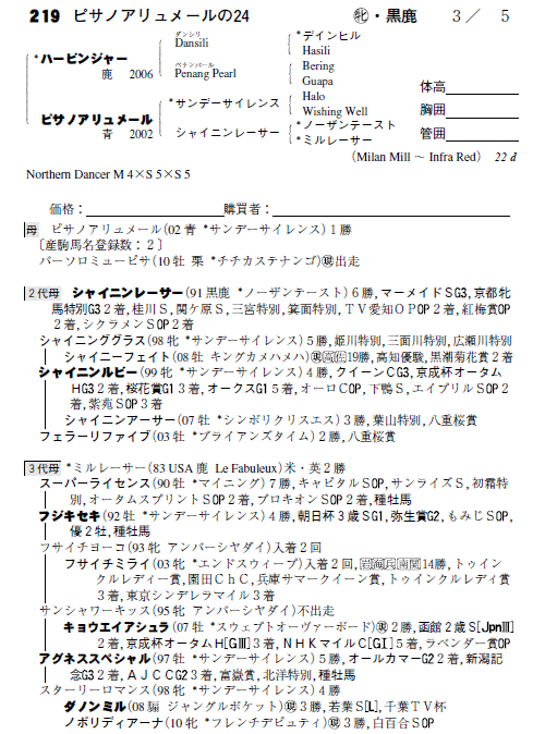 父:ハービンジャー 母:ピサノアリュメール(母父:サンデーサイレンス)