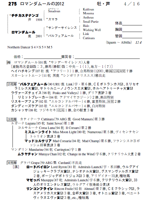 父:チチカステナンゴ 母:ロマンダムール(母父:サンデーサイレンス)