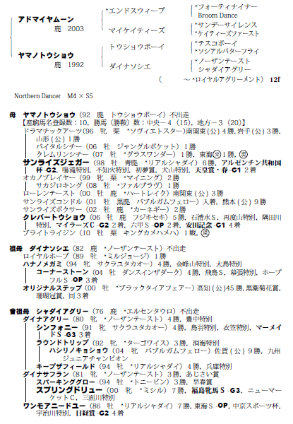 | 父:アドマイヤムーン 母:ヤマノトウショウ(母父:トウショウボーイ) |