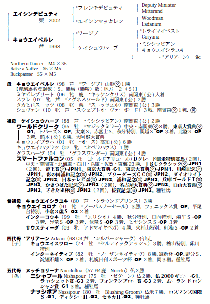 | 父:エイシンデピュティ 母:キョウエイペルレ(母父:ワージブ) |