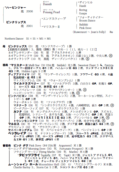 | 父:ハービンジャー 母:ピンクリップス(母父:エンドスウィープ) |