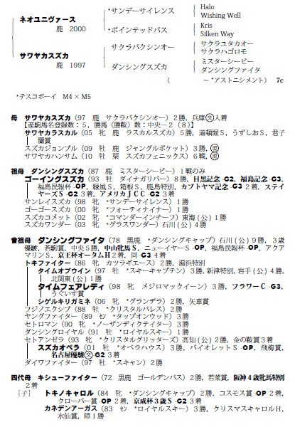 | 父:ネオユニヴァース 母:サワヤカスズカ(母父:サクラバクシンオー ) |