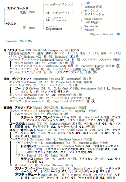| 父:ステイゴールド 母:タスク(母父:Mr. Prospector) |