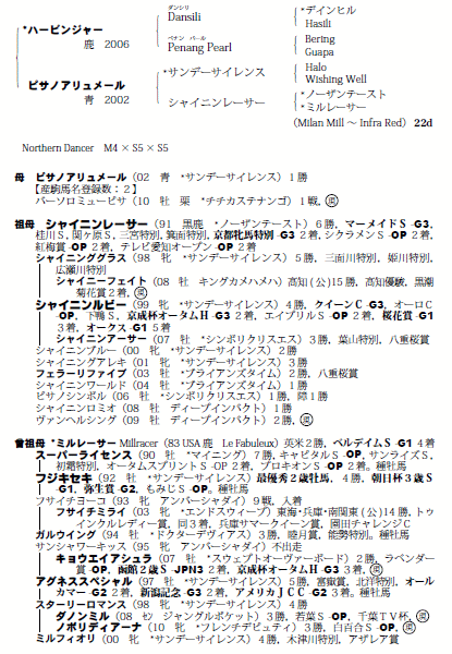 父:ハービンジャー 母:ピサノアリュメール(母父:サンデーサイレンス)