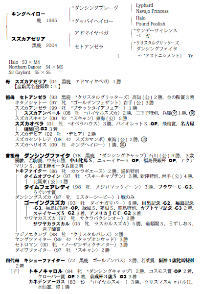 父:キングヘイロー 母:スズカアゼリア(母父:アドマイヤベガ)