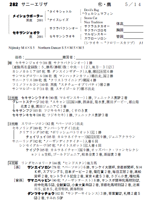 父:メイショウボーラー 母:セキサンジョオウ(母父:サクラバクシンオー)