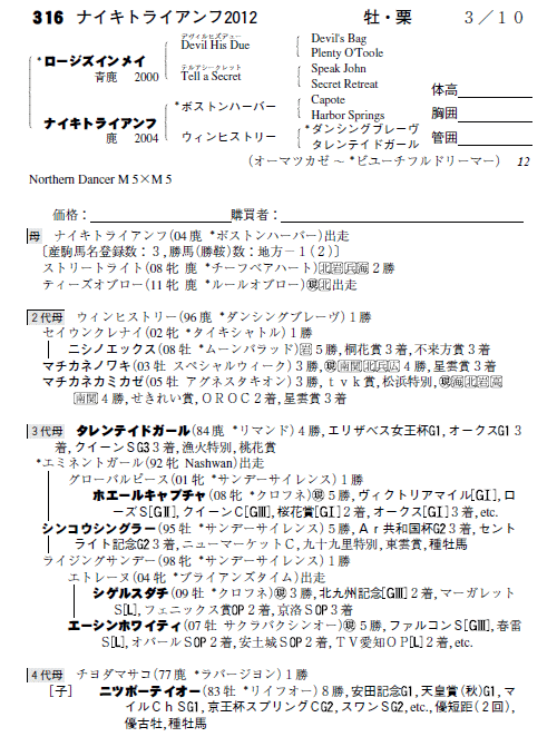 父:ロージズインメイ 母:ナイキトライアンフ(母父:ボストンハーバー)