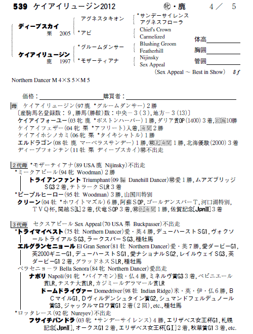 父:ディープスカイ 母:ケイアイリュージン(母父:グルームダンサー)