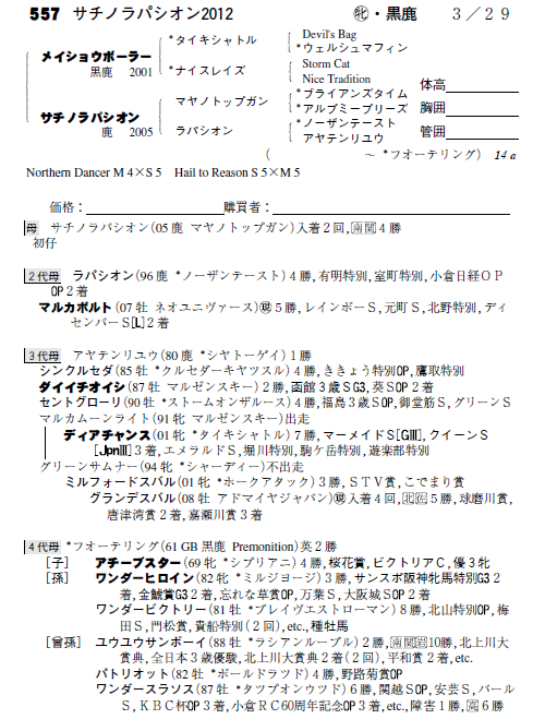 サチノラパシオン2012 牝 黒鹿 2012/3/29生 |