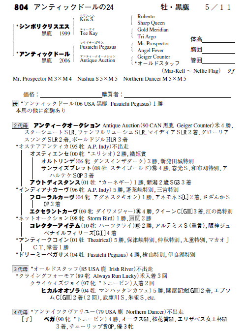 | 父:シンボリクリスエス 母:アンティックドール(母父:Fusaichi Pegasus) |
