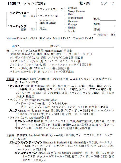 父:キングヘイロー 母:コーディング(母父:Mark of Esteem)