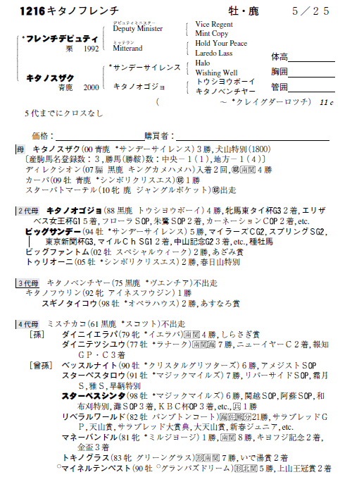 | 父:フレンチデピュティ 母:キタノスザク(母父:サンデーサイレンス) |
