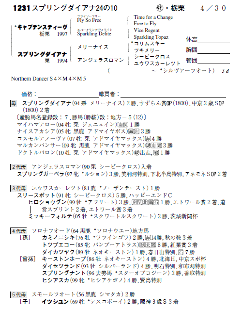 父:キャプテンスティーヴ 母:スプリングダイアナ(母父:メリーナイス)