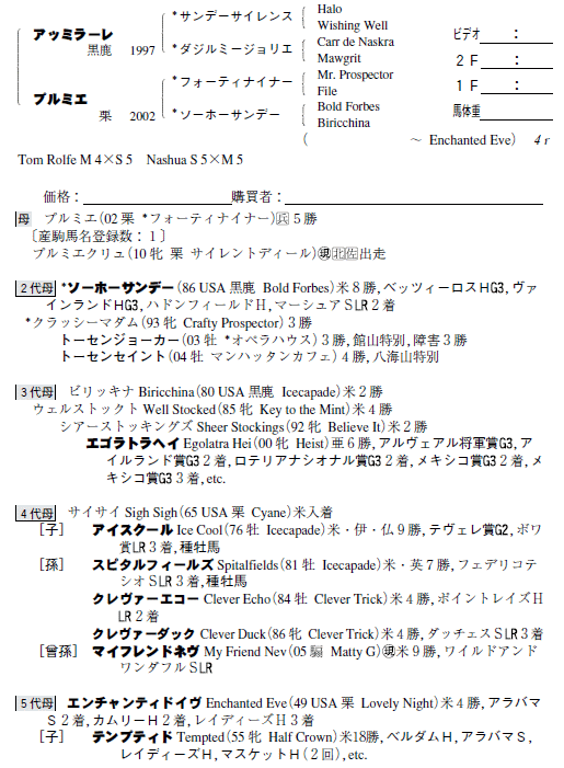 | 父:アッミラーレ 母:プルミエ(母父:フォーティナイナー) |