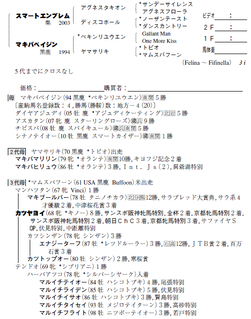 | 父:スマートエンブレム 母:マキバベイジン(母父:ペキンリユウエン) |