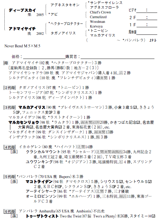 父:ディープスカイ 母:アドマイヤイチ(母父:ヘクタープロテクター)