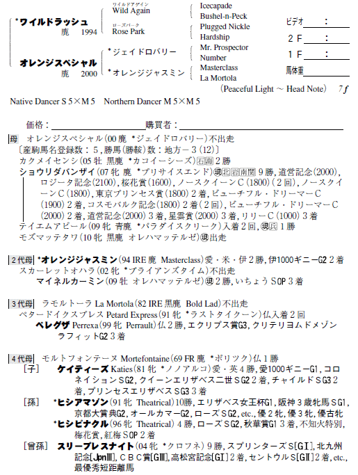 父:ワイルドラッシュ 母:オレンジスペシャル(母父:ジェイドロバリー)
