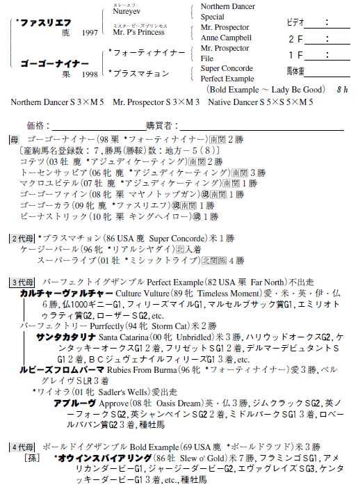 | 父:ファスリエフ 母:ゴーゴーナイナー(母父:フォーティナイナー) |