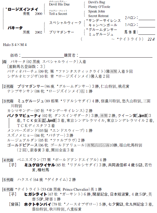 | 父:ロージズインメイ 母:パキータ(母父:スペシャルウィーク) |